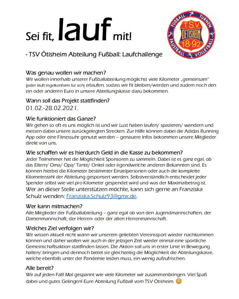 Die Abteilung Fußball startet am 01.02.2021 eine Laufchallenge – wir sind gespannt, wie viele Kilometer wir gemeinsam erreichen können.