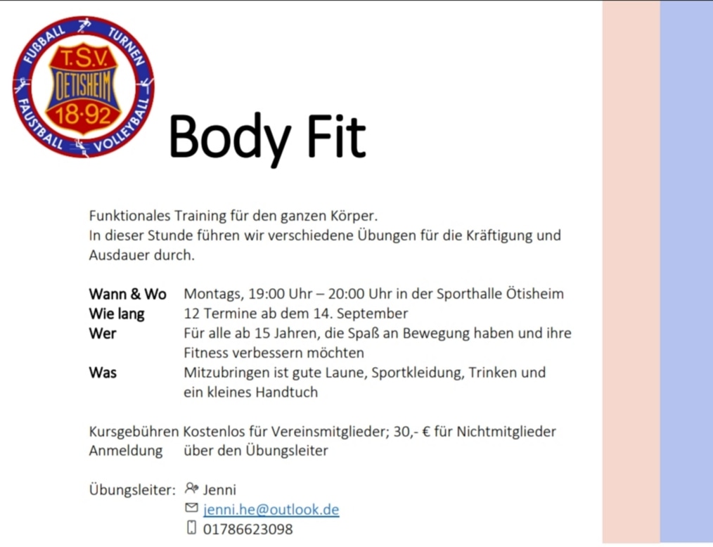 Ab September finden Montags von 19 bis 20 Uhr unser neuer Kurs „Body Fit“ statt.