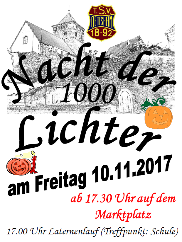 Der TSV Ötisheim lädt zur alljährlichen Nacht der 1000 Lichter. Freitag, 10.11.2017 ab 17:30 Uhr auf dem Marktplatz in Ötisheim.